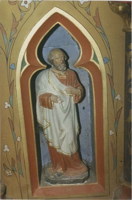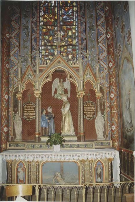 La polychromie est partiellement réalisée au pochoir. L'ensemble est traité dans un style néogothique.