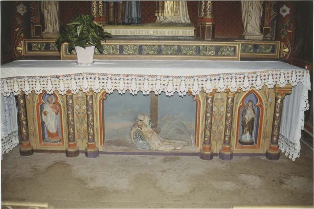 Dimensions de l'autel : h = 95 ; la = 290 ; dimensions des statues : h = 49 ; dimensions du groupe sculpté : h = 143 ; la = 107 ; pr = 59