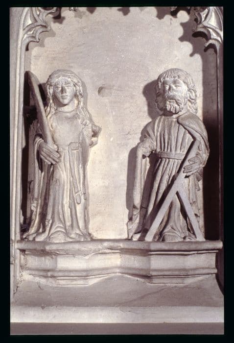Dans un encadrement mouluré, sur trois arcatures polylobés, des personnages sont sculptés, le Christ, la Vierge, saint Jean, une sainte, saint André, saint Jacques et sainte Marguerite.