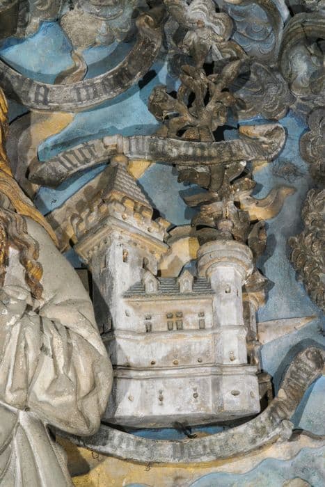 bas-relief : la Vierge entourée des symboles de ses litanies