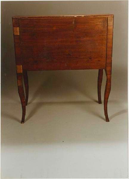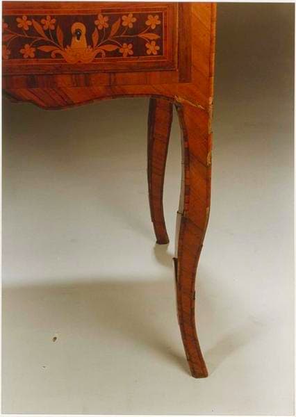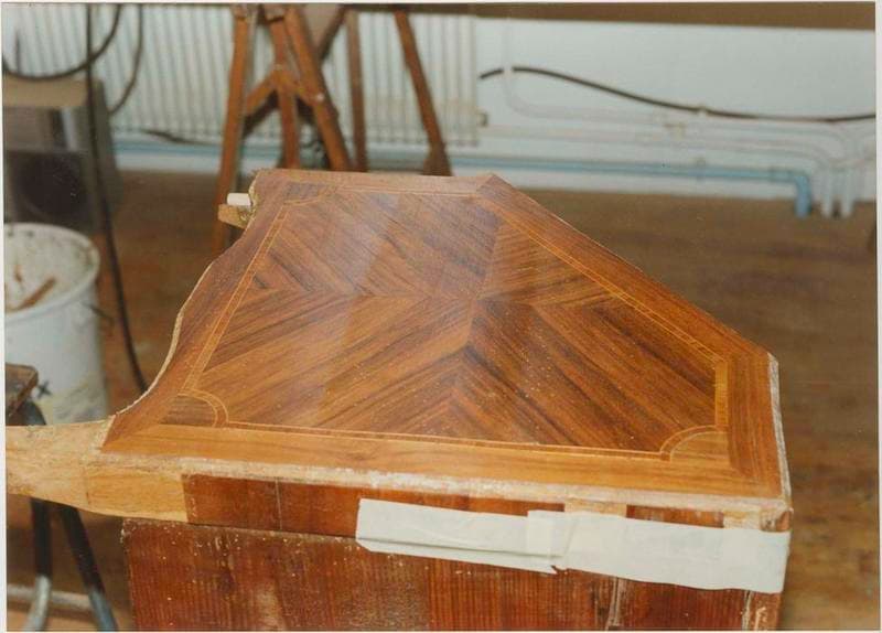 Le bâti en chêne et sapin est marqueté et incrusté de bois rares.