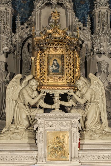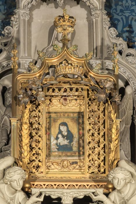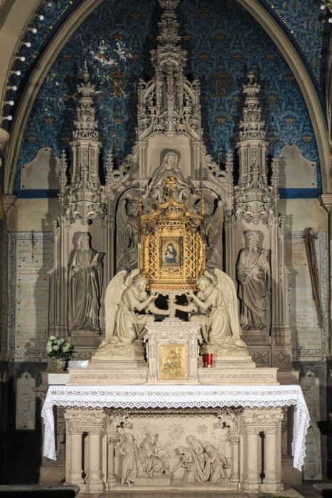 chapelle Notre-Dame des Vertus, reliquaire en cuivre doré placé au-dessus du tabernacle de l'autel