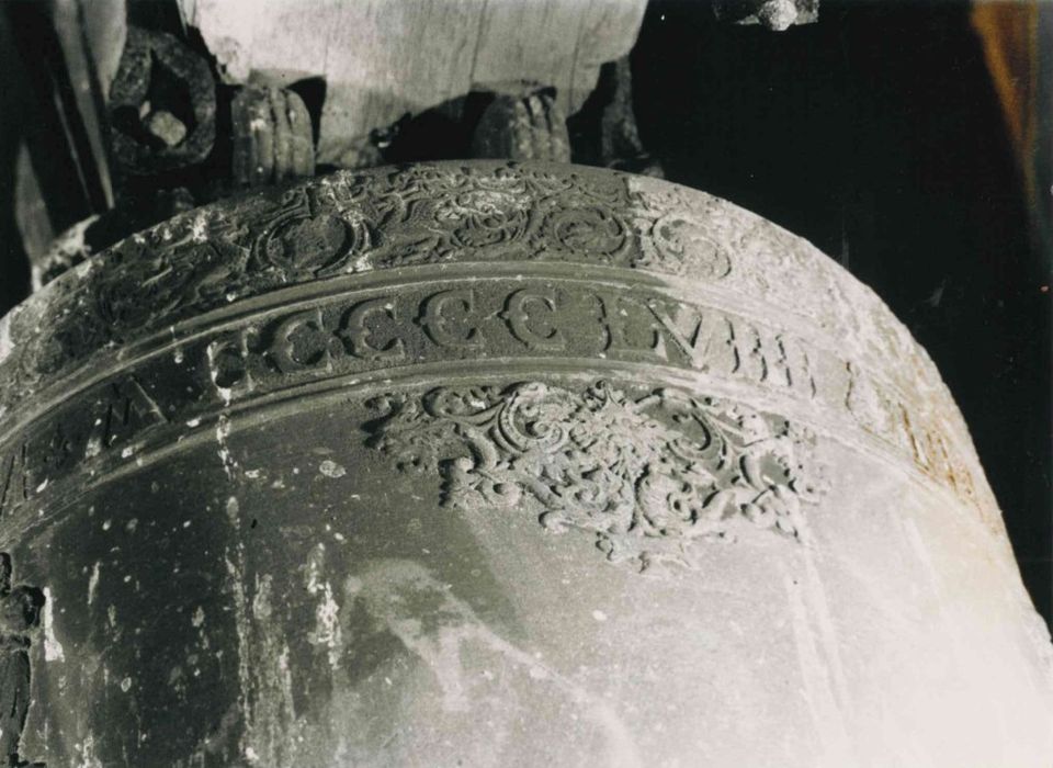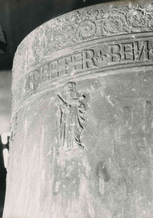 Inscription : MCCCCCLVIII + PEETER-BEN-IC-VAN-PEETER-VANDEN-GHEIN-GHEGOTEN (Les A sont couverts d'une barre et les N sont à l'envers). Transcription : + 1558 Pierre suis je de Pierre Van Den Ghein fondeur, c'est à dire Mon nom est Pierre, j'ai été fondue par Pierre Van Den Ghein.