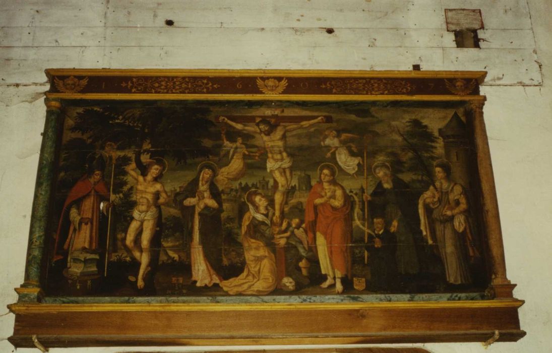 tableau : la Crucifixion, saint Sébastien, sainte Barbe, saint Eloi, un donateur et son patron
