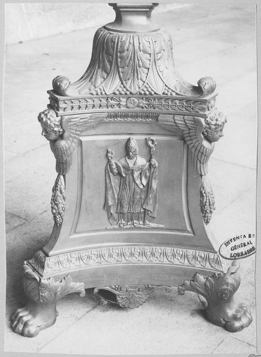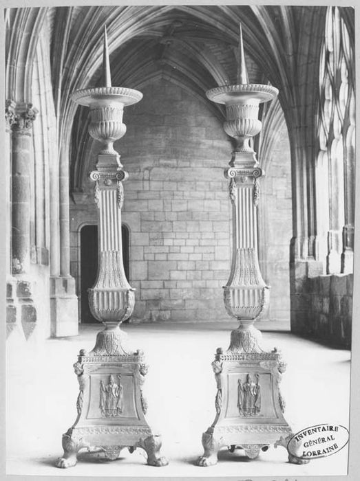 Ces quatre chandeliers font partie d'un ensemble de 6 chandeliers identiques (l'un est conservé dans l'église d'Onville (54) et l'autre dans l'église Saint-Pie X d'Essey-les-Nancy).