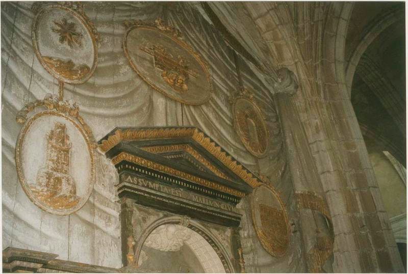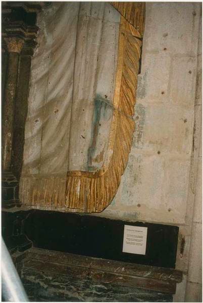 Le retable à colonnette en marbre et pierre est divisé en trois compartiments. Le manteau, ajouté, est en bois orné des symboles de la Vierge tirés des litanies.