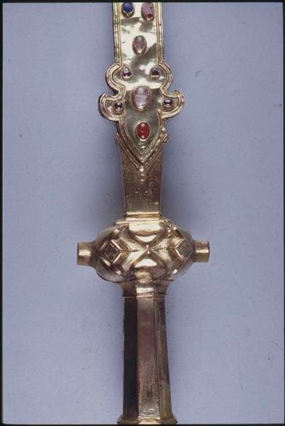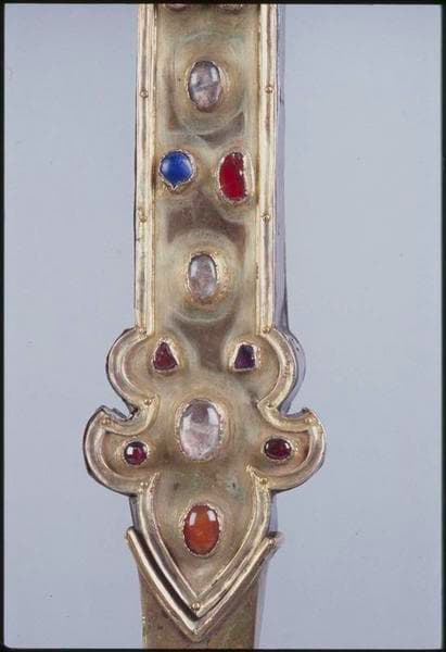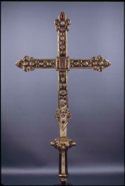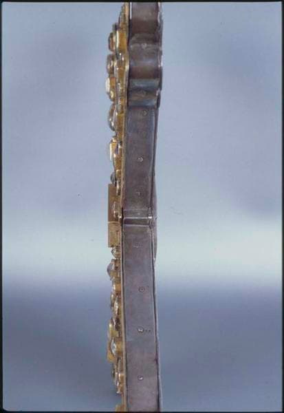 En argent, vermeil et cabochons. Noeud cuivré avec traces d'émail. Au centre, se trouve un reliquaire de la Croix.