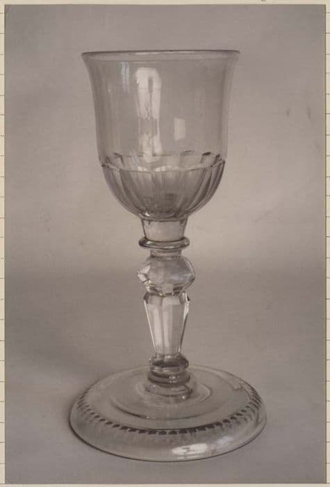 Pied circulaire relevé à godrons surmonté d'une tige en cristal taillé au noeud à facettes multiples soutenant une coupe. Le premier tiers est taillé. Le reste est lisse.