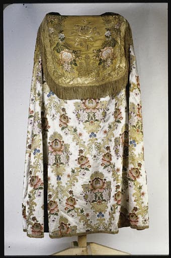 Chape à fond damassé blanc moiré à décor floral en soie polychrome avec chaperon en damas blanc, et soie polychrome ou fils d'or et d'argent.