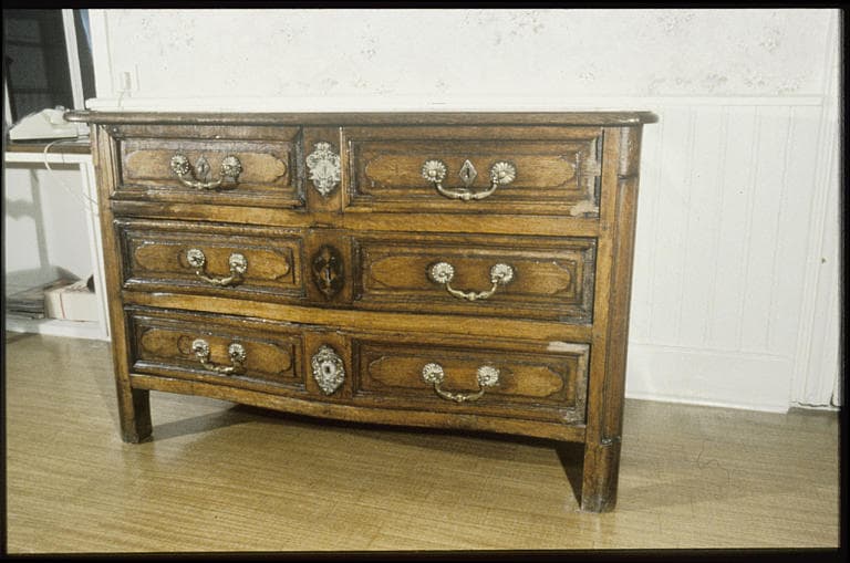 Commode à deux petits tiroirs supérieurs et deux grands tiroirs central et inférieur avec plateau en chêne et pieds droits. Les ouvertures de serrures en bronze montrent au-dessus d'un médaillon de bordure floral la tête d'un personnage à chevelure de style baroque.