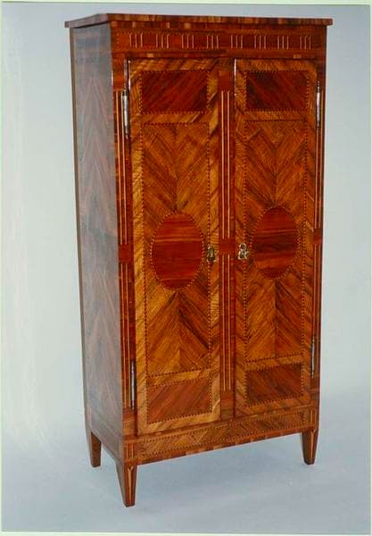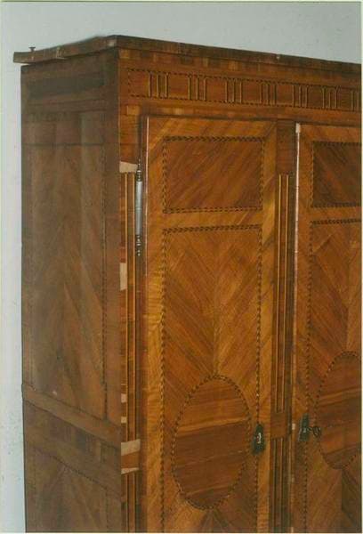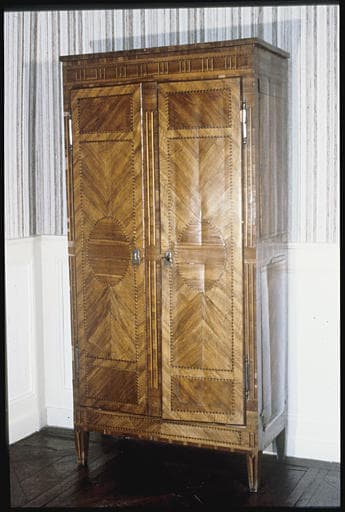 Armoire de style et d'époque Louis XVI à marqueterie et incrustations en bois précieux. Deux battants à décor symétrique. Entrées de serrure en laiton. Assemblage par chevilles.
