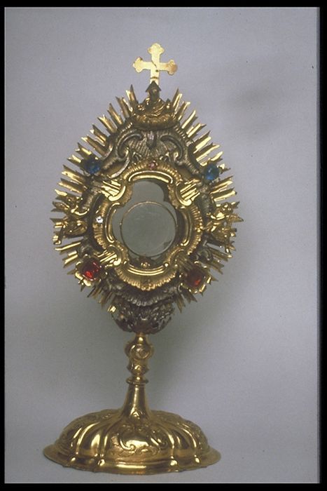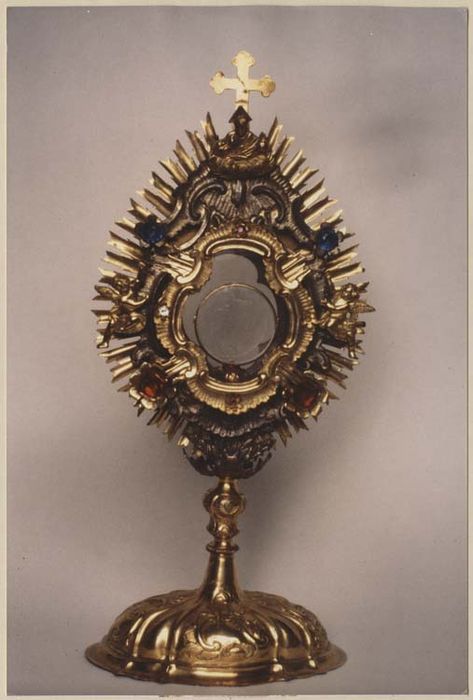 Pièce d'orfèvrerie d'origine allemande. La seule pièce de style comparable en Meuse est un calice de Tronville-en-Barrois (pied et noeud).