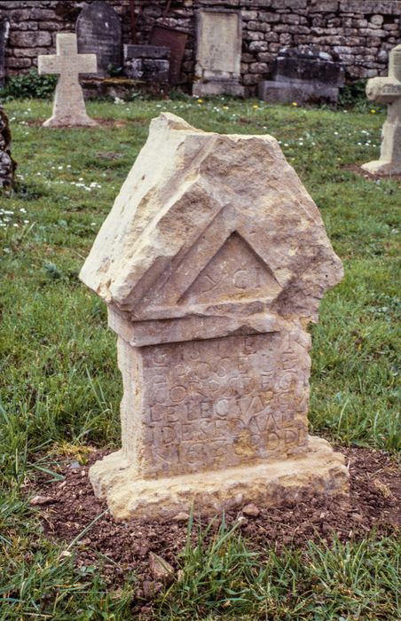 Epitaphe (dans le triangle) : Y CI GIST ET R/EPOSE LE CORPS DE GI/LE LECVY QV/I DESEDA A LA/N 1628 PDPL (= priez Dieu pour lui).