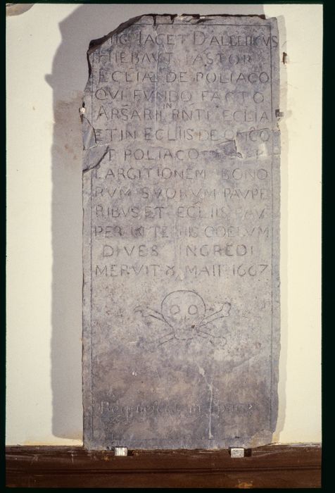 Epitaphe : IC lACET D'ALBERICUS THIEBAVT PASTOR ECLTAE DE POLIACO QVI FUNDO FACTO ARSA RII IN PNTI ECCLIA ET IN ECLIIS DE ONCO ET POLIACO POST LARGITIONEM BONO RUM SVORUM PAV PE RIBUS ET ECCLIIS PAU PER IN TERRIS COELUM DIVES INGREDI MERVIT 8 MAII 1667 REQUIESCAT IN PACE. Traduction : ci gît d'Abéric Thiébaut pasteur de l'église de Pouilly qui ayant fait une fondation (avec assise de sol) d'anniversaire dans l'église de pont (?) et dans les églises de Yonck (Ardennes) et de Pouilly après avoir distribué ses biens aux pauvres et aux églises, pauvre sur la terre il mérita d'être riche au ciel le 8 mai 1667 qu'il repose en paix (gravée au stylet en majuscules latines).
