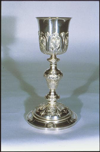 Intérieur de la coupe en argent doré. Pied circulaire et noeud piriforme. Fausse coupe en argent découpé.