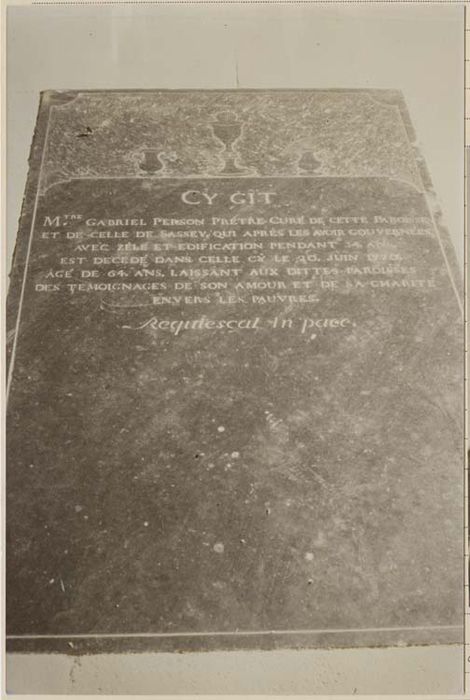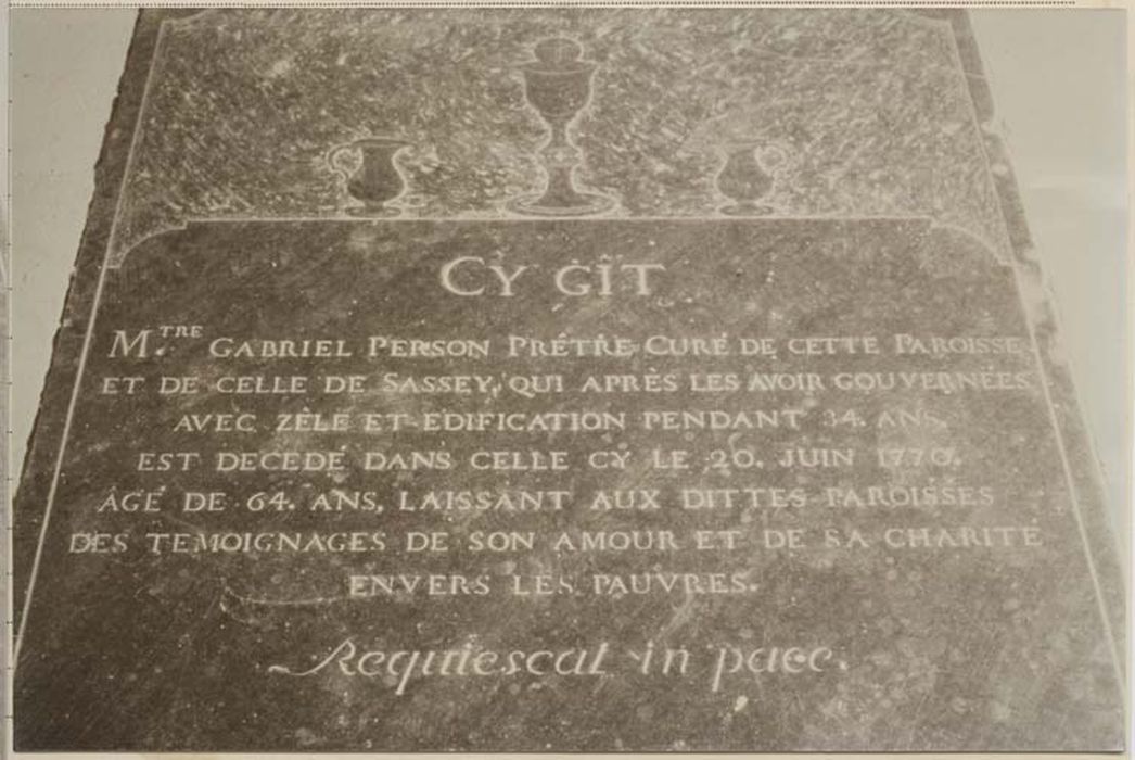 Transcription : Cy gît Mtre Gabriel Person prêtre curé de cette paroisse et de celle de Sassey qui après les avoir gouvernées avec zèle et édification pendant 34 ans est décédé dans celle-ci le 20 juin 1770 âge de 64 ans laissant aux dites paroisses des témoignages de son amour et de sa charité envers les pauvres. Requiescat in pace.