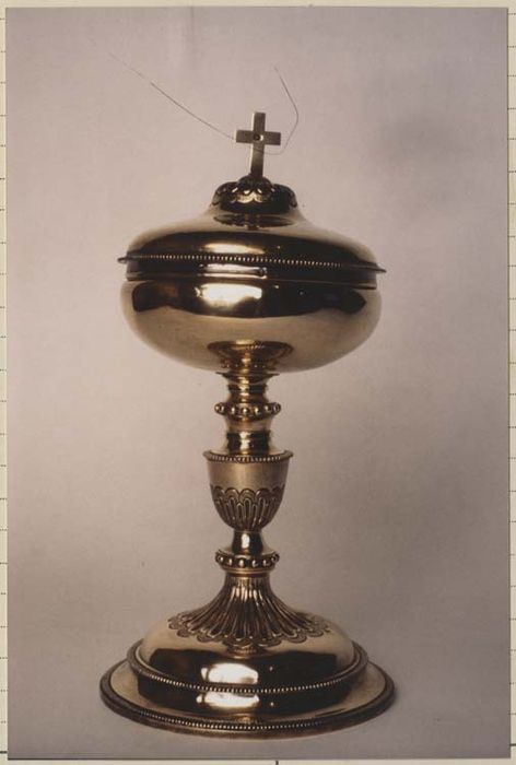 couvercle : petite croix plate le surmontant au centre. sortes de palmettes allongées en éventail sur le pied à partir de la tige sur le noeud sur le couvercle