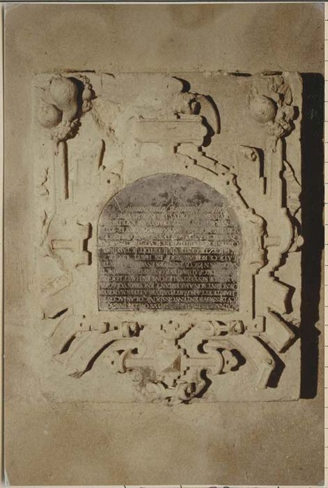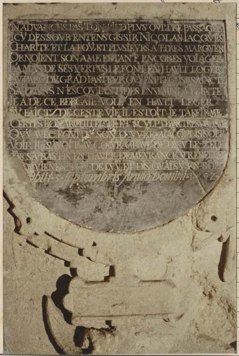 Epitaphe en vers alexandrins français : N'avance pas ton pied plus avant passager/Ici dessous sache que repose Nicolas Jacques/Charité et la Foi et plusieurs autres marques (= qualités) /Ornaient son âme alors qu'il était encore en voyage/L'amas de ses vertus le font en haut loger/au Parc du Grand Pasteur qui est l'Eglise sainte (= le Paradis) /S'en étant tenu nécoutant des ennemis la feinte (= les ruses de Satan) /Il a de ce bercail volé en haut léger/Au fait de cette vie il était je t'affirme/Certes bon architecte et sculpteur très sublime/Qui avec équité son oeuvre accomplissait/Voir il savait au coeur grave (= noble) de Dieu le zèle/Et se bâtit en haut demeurance (= demeure) très belle/Souviens-toi de lui et dès qu'il en soit ainsi. Date : Obiit 5 Septembris Anno Domini 1592.