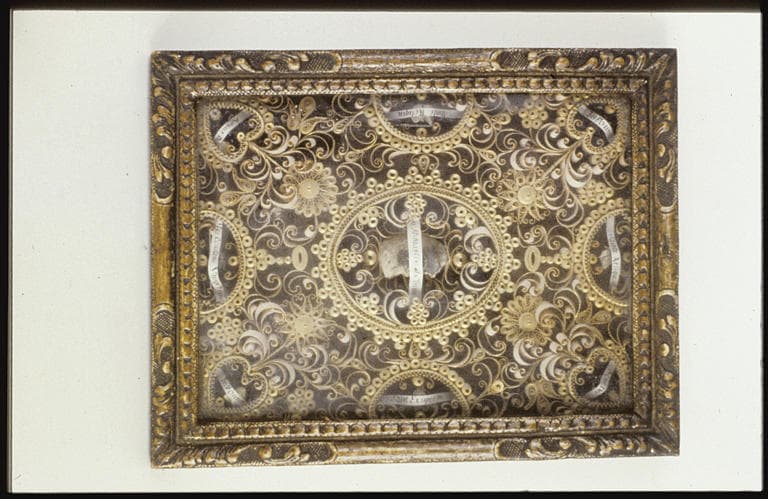 Deux reliquaires dans le même cadre en bois sculpté. Volutes et spirales en papier doré.