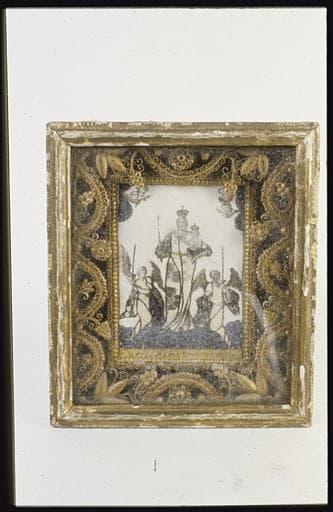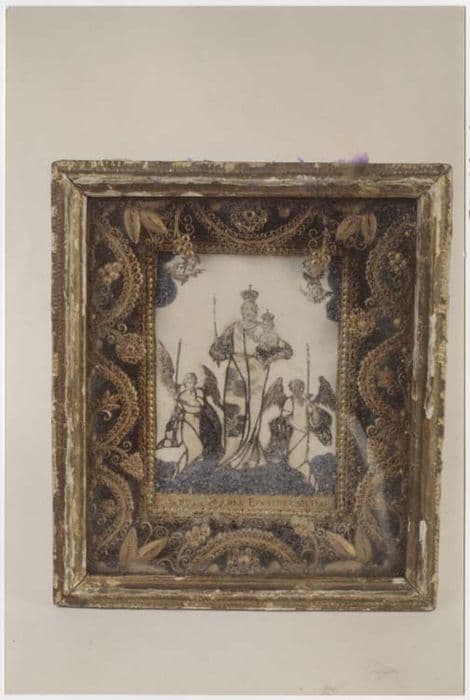 Deux cadres enferment une image en fil de soie sur papier de la Sainte Famille et Notre-Dame d'Einsiedeln (Suisse).