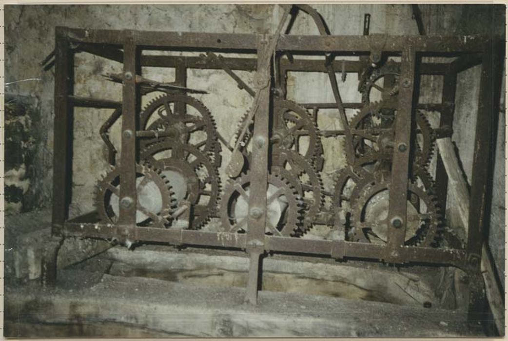 Ce mouvement ancien est placé dans un bâti en fer forgé claveté. Les axes sont de section carrée avec bagues en laiton (probablement refaites). Il y a trois trains d'engrenage (rouages parallèles) : à droite, le mouvement (le temps). L'échappement est à ancre avec roue en laiton (en haut à droite). Au centre, le train de sonnerie des heures. A gauche, le train de sonnerie des quarts et demies (c'est ce train qui pouvait autrefois animer les jacquemarts).