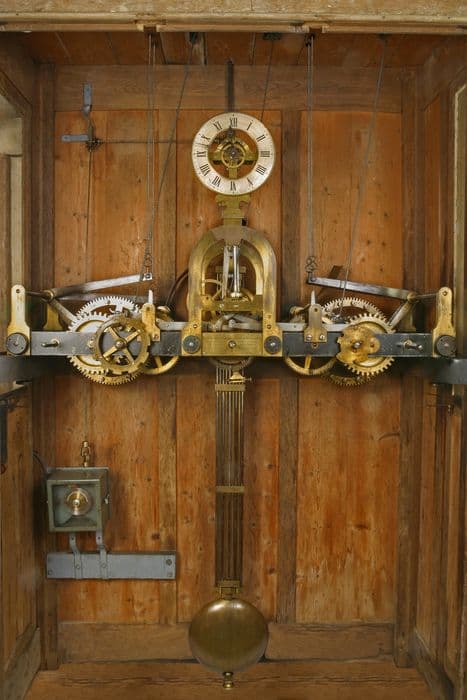 Belle pièce de maîtrise, avec trois rouages horizontaux, une sonnerie au quart avec un coup d'avertissement trois minutes avant le déclenchement de chaque sonnerie. L'échappement à chevilles utilise les différences de dilatation entre les tiges en acier qui se dilatent vers le bas et les tiges en laiton qui se dilatent vers le haut, annulant les différences de réglage dues aux écarts de température. Les différents pignons de cette horloge sont de type lanterné et non taillé, constituées de deux plaques en laiton entre lesquelles sont implantées des goupilles rouleaux en guise de dents. Seuls les deux pignons des volants régulateurs de sonnerie trop petits pour être lanternés sont taillés. Les longerons du châssis sont en fonte, avec des paliers laiton rapportés. Les roues et la partie centrale sont en laiton gravé et argenté. Toutes les pièces en acier sont forgées. La transmission au cadran extérieur est réalisé depuis le cadran de contrôle par des tringles en acier et des renvois d'angle en laiton.