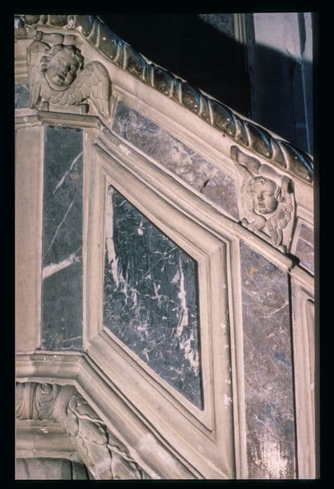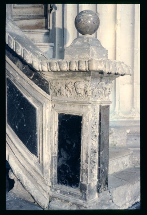 Chaire en pierre composée d'un escalier en pierre avec appuie-main largement saillant. Cet escalier conduit à une cuve hexagonale à 4 panneaux séparés par des pilastres.