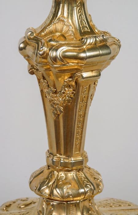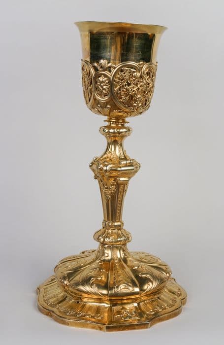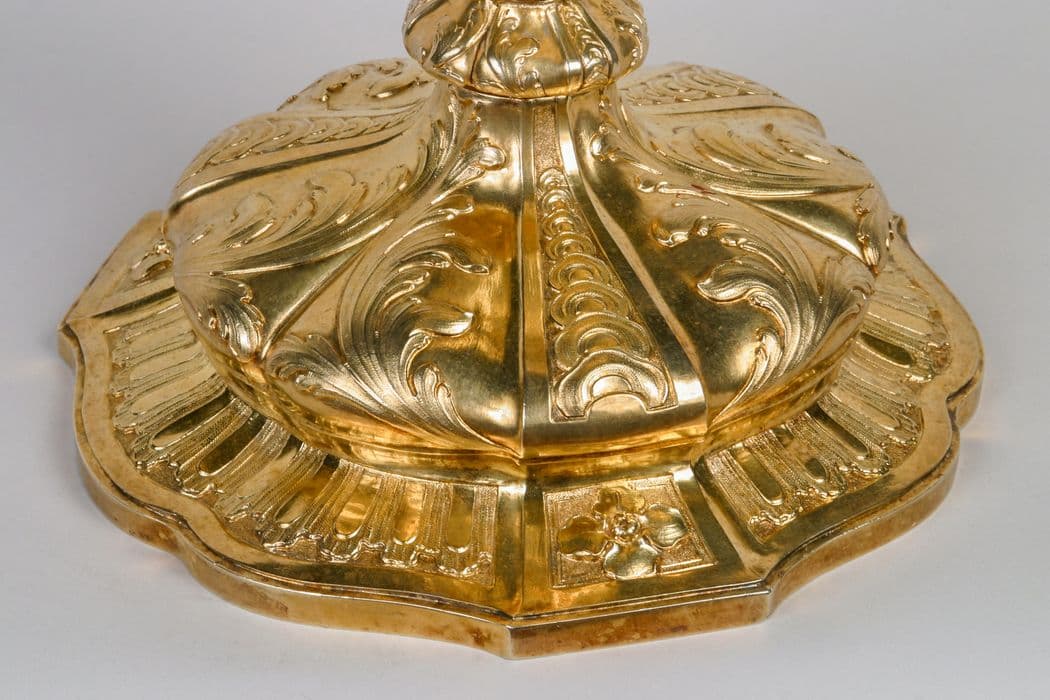 Ce calice se caractérise par l'élégance de son noeud d'esprit Louis XVI et la richesse de la fausse-coupe.