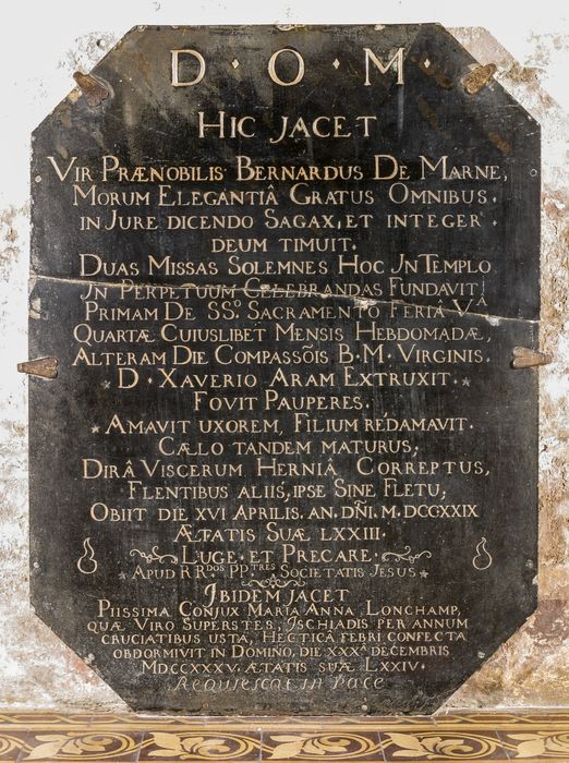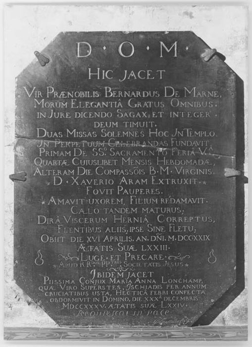 Transcription : D.O.M/HIC JACET/VIR PRAENOBILIS BERNARDUS DE MARNE/MORUM ELEGANTIA GRATUS OMNIBUS/IN JURE DICENDO SAGAX ET INTEGER/DEUM TIMUIT/DUAS MISSAS SOLEMNES HOC IN TEMPLO/IN PERPETUUM CELEBRANDAS FUNDAVIT/PRIMAM DE SS. SACRAMENTO FERIA V[?]A/QUARTAE CUIUSLIBET MENSIS HEBDOMADAE/ALTERAM DIE COMPASSO[?]IS B.M. VIRGINIS/D. XAVERIO ARAM EXTRUXIT/FOVIT PAUPERES/AMAVIT UXOREM FILIUM REDAMAVIT/CAELO TANDEM MATURUS/DIR A[?] VISCERUM HERNIA CORREPTUS/FLENTIBUS ALIIS IPSE SINE FLETU/OBIIT DIE XVI APRILIS AN. DNI. M. DCCXXIX/AETATIS SUAE LXXIII/LUGE ET PRECARE/APUD R R[?]DOS PP[?]TRES SOCIETATIS JESUS. 2nde inscription : IBIDEM JACET/PIISSIMA CONJUX MARIA ANNA LONCHAMP/QUAE VIRO SUPERSTES ISCHIADIS PER ANNUM/CRUCIATIBUS USTA HECTICA FEBRI CONFECTA/OBDORMIVIT IN DOMINO DIE XXX[?] DECEMBRIS/MDCCXXXV AETATIS SUAE LXXIV/REQUIESCAT IN PACE. signature : GHUMBERT F.