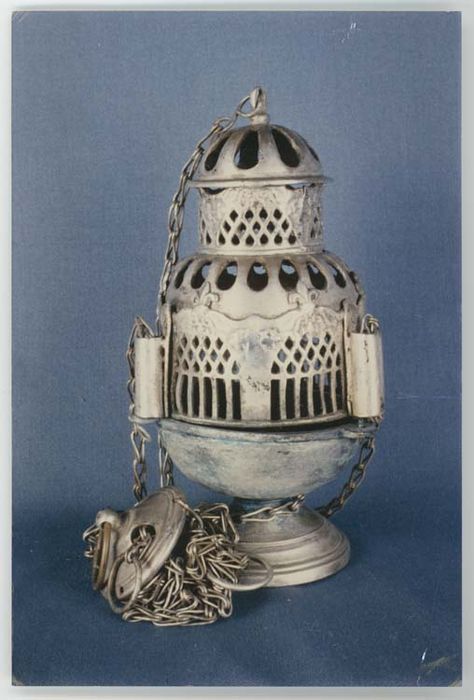 L'encensoir se compose d'une coupe hémisphérique portée par un pied circulaire. Le couvercle comporte deux étages d'architecture percés d'un fenestrage flamboyant surmonté de fleurs de lys. Trois tubes verticaux permettent le passage de la chaîne.