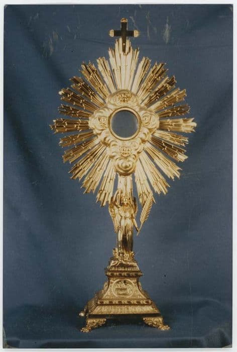 Cet ostensoir se caractérise par un pied posé sur quatre pattes félines. Le pied possède des médaillons dont l'un est orné d'une représentation de la Cène, on note aussi la présence de raisins et d'un triangle divin. La tige est constituée d'un ange cariatide, tenant une palme dans sa main gauche et soutenant un large soleil. Le soleil est surmonté d'une croix.
