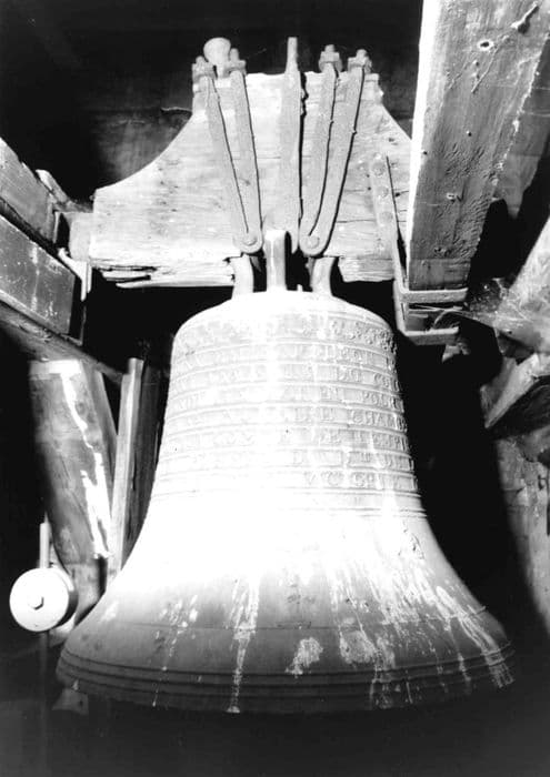 Cloche en bronze, battant en fer et ferrures de fixation et traverse d'appel en bois d'époque.