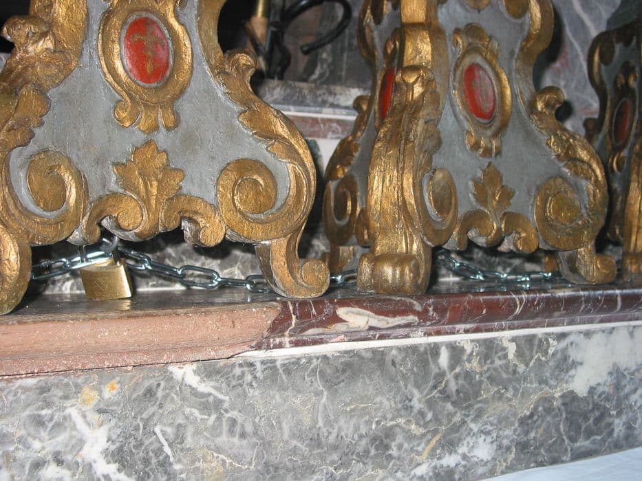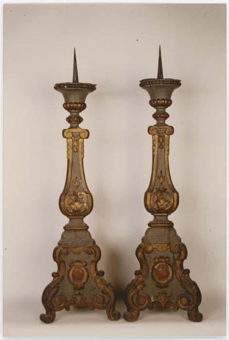 Chandeliers à pied pyramidal orné de volutes et d'un écu central portant une fleur de lys. Le corps principal est étranglé, orné de feuilles d'acanthe et surmonté d'un chapiteau ionique. Ce chapiteau soutient un porte-cierge décoré de godrons.