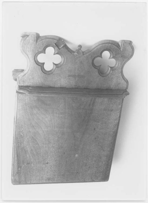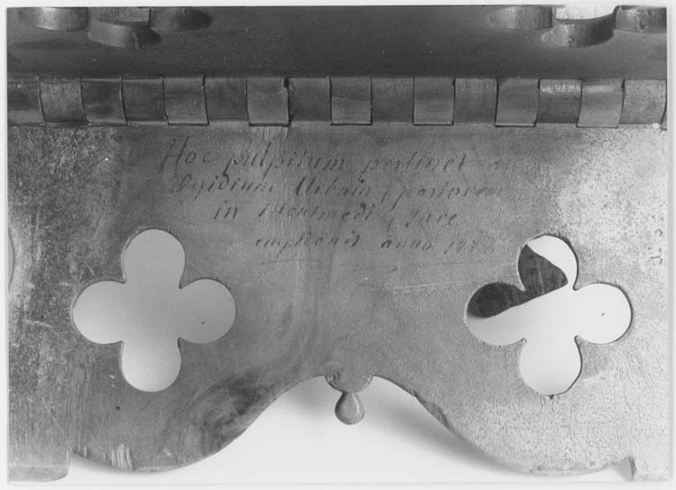 Inscription manuscrite à l'encre, sur le rebord : HOC PULPITUM PERTINET AD/ELYIDIUM URBAIN PASTOREM/IN MONTMEDI, JURE EMPTIONIS ANNO 1773. Traduction : Ce pupitre appartient à Clyde Urbain, pasteur à Montmédy, il fut acheté en 1773.