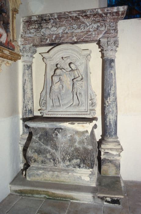Fonts baptismaux ornés d'un décor en haut-relief. Encadrement sculpté avec entablement et colonnes.
