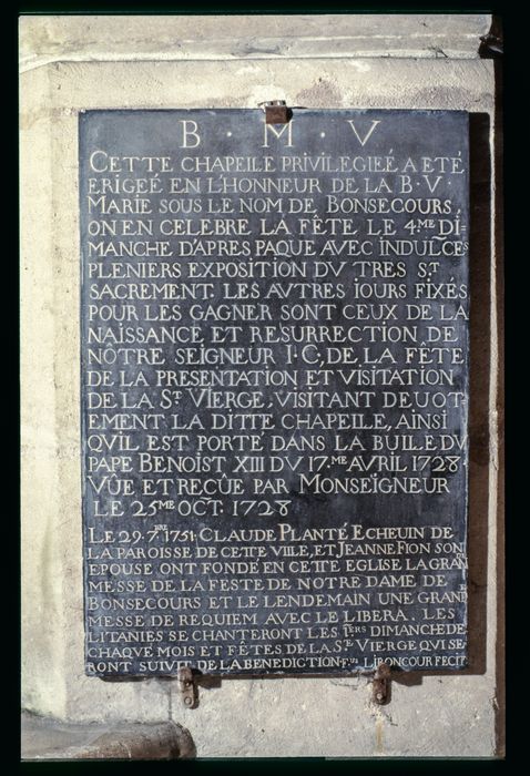 POP | Plateforme ouverte du patrimoineplaque commémorative : inscription relative à l'érection de la chapelle Notre-Dame de Bonsecours et fondations de messes