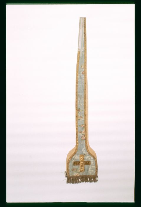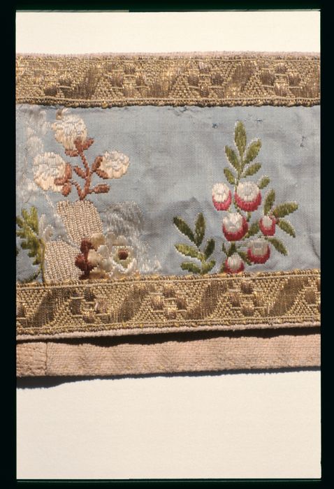 Etole en soie bleue et fils d'or, à décor floral polychrome.
