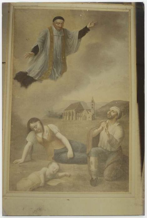 tableau et son cadre : Saint Vincent de Paul venant en aide à des habitants de Saint-Mihiel devant l'église Saint-Etienne