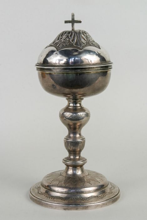 Ciboire en argent (coupe, couvercle) et laiton (tige, pied) avec décor floral ciselé et repoussé.