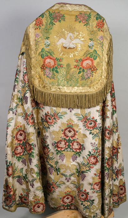 Chape blanche à décor floral polychrome, chaperon doré à fleurs polychromes et pélican nourricier.