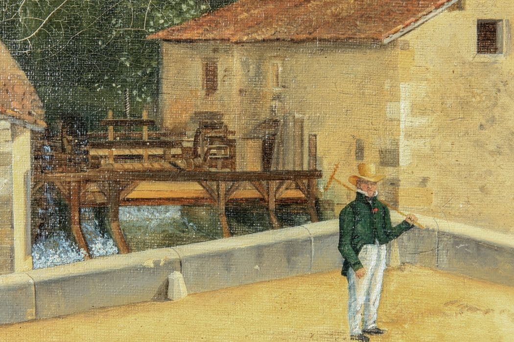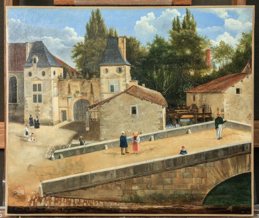 tableau : Vue de Sorcy montrant le château, le pont, le moulin