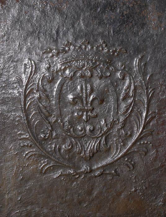 Plaque de cheminée ornée d'un motif architectural surmonté d'une couronne royale, de fleurs de lys et d'oiseaux.