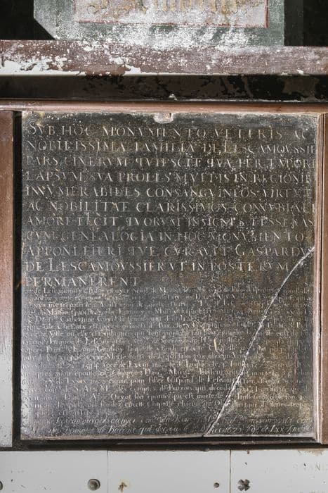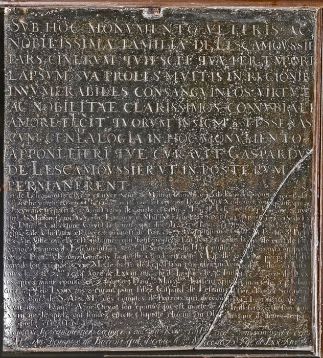 Epitaphe et inscription commémorative détaillant la généalogie de la famille Lescamoussier du 15e siècle au 17e siècle.