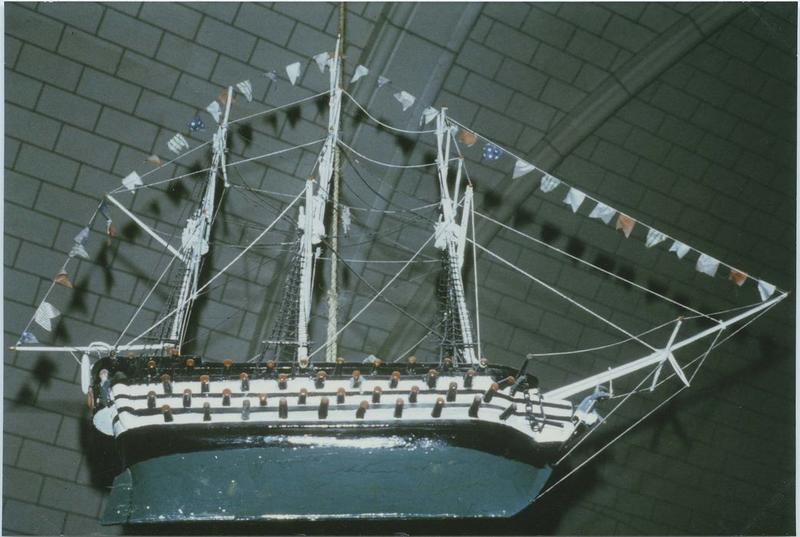 Maquette d'un trois mats carré de guerre. Coque : sous la ligne de flottaison, en bleu, au-dessus et entre les batteries, en noir, aux niveaux des trois batteries inférieures, en blanc et en noir au niveau de la batterie supérieure. Personnage en figure de proue, aigle sur le château arrière et deux ancres. Armement : quatre rangées de dix sabords, canons gueules rouges et fûts noirs. Mature : cinq vergues au grand-mât, quatre vergues au mât de misaine, trois vergues au mât d'artimon, mâts et vergues étant en blanc, avec l'extrémité des vergues en rouge et avec un grand pavois.