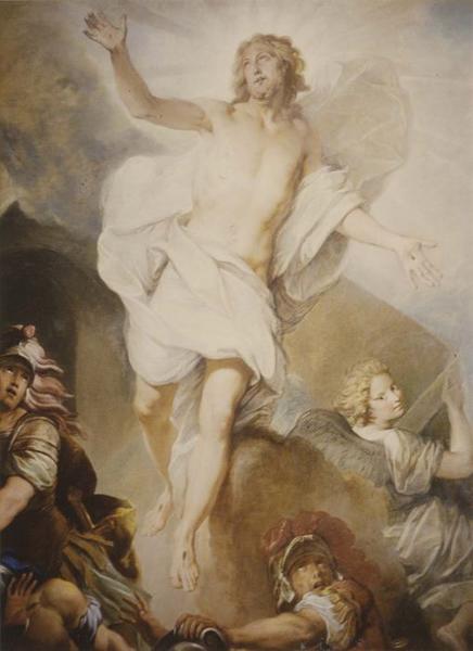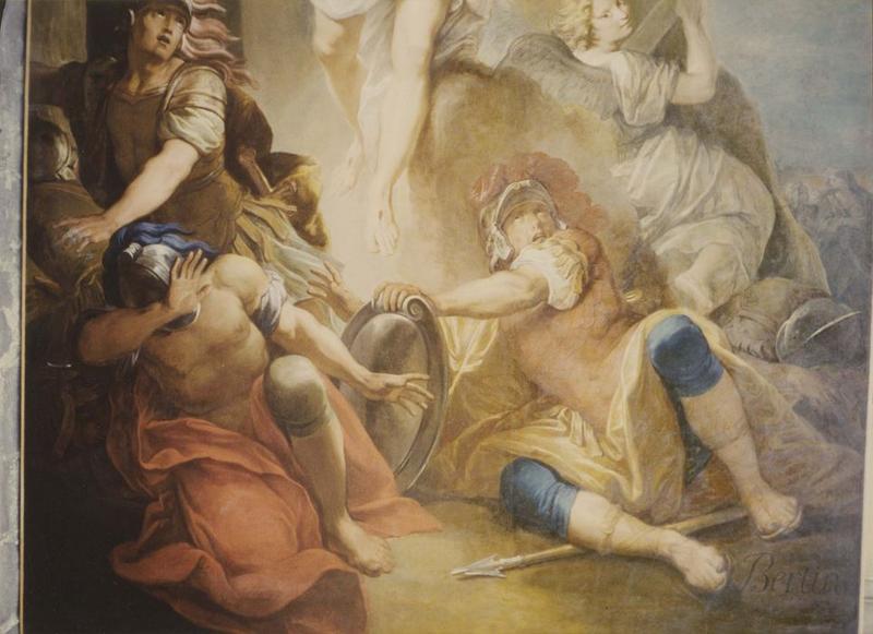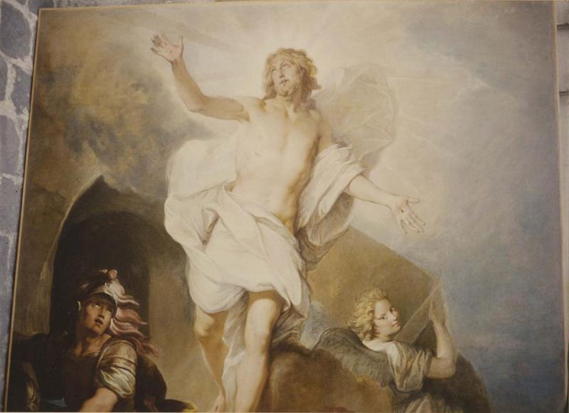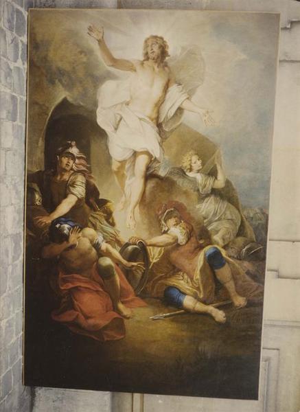 Retable majeur. Le tableau central représente la Résurrection. De chaque côté sont deux niches à frontons cintrés, encadrées de trois colonnes qui supportent un entablement. L'étage supérieur comporte aussi trois niches dont les riches frontons sont supportés par des cariatides.