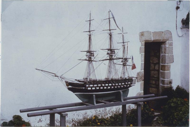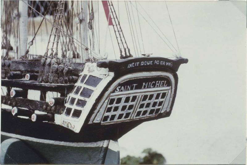 Maquette de procession, trois mâts carré, de guerre, le saint Michel. Inscriptions sur la poupe à la peinture blanche. Coque : ligne de flottaison blanche, avec au-dessous du vert, au-dessus, entre les batteries, du noir et aux niveaux des batteries, du blanc. Figure de proue représentant un buste d'homme barbu et vêtu d'un justaucorps. Une ancre en bois noir de chaque côté de la coque. Armement : trois batteries, au total, quatre vingt deux sabords et pas de sabords au château arrière. Pont : aucune superstructure ni surélévation, morceau de contre-plaqué léger rapporté et non peint. Mâture : quatre vergues et deux hunes à chaque mât, bas des mâts blanc et les deux tiers supérieurs bruns et vergues noires, une flamme tricolore au sommet du grand mât et un pavillon tricolore à la corne d'artimon.