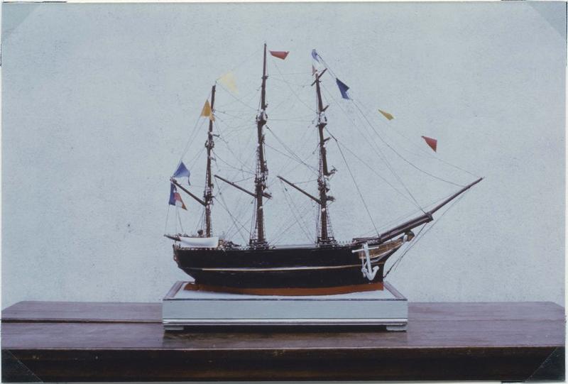 Maquette de procession d'un trois mâts carré de commerce, de type cap-hornien, sans nom. Coque taillée dans la masse, noire avec liseré or et bande rouge sous ligne de flottaison, figure de proue (peut-être une tête d'ange). Pont : peint en vert avec deux gaillards marrons, un petit personnage à la barre, deux annexes de part et d'autre du gaillard arrière (extérieur blanc, intérieur rouge), deux ancres de bois de part et d'autre de l'avant. Mâture : cinq vergues à chaque mât, mât de misaine brisé à hauteur de la dernière vergue, pavillons tricolores au mât de misaine et à la corne d'artimon, grand pavois de sept pavillons, à partir du beaupré : rouge, jaune, bleu, rouge, jaune, orange, bleu.