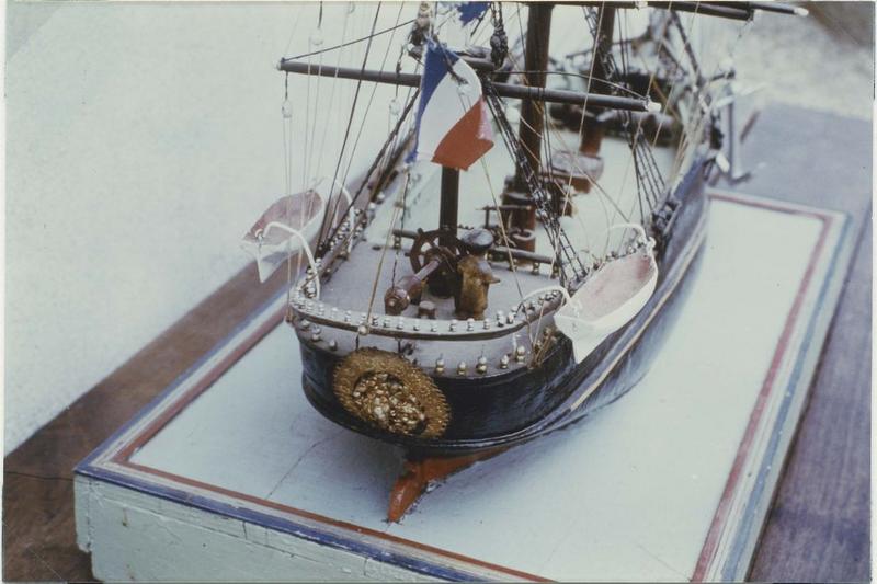 Oeuvre exécutée vers 1900. Portée en procession pour le Pardon de Notre-Dame de la Garde. Maquette précise, présence exceptionnelle de personnage sur le pont.