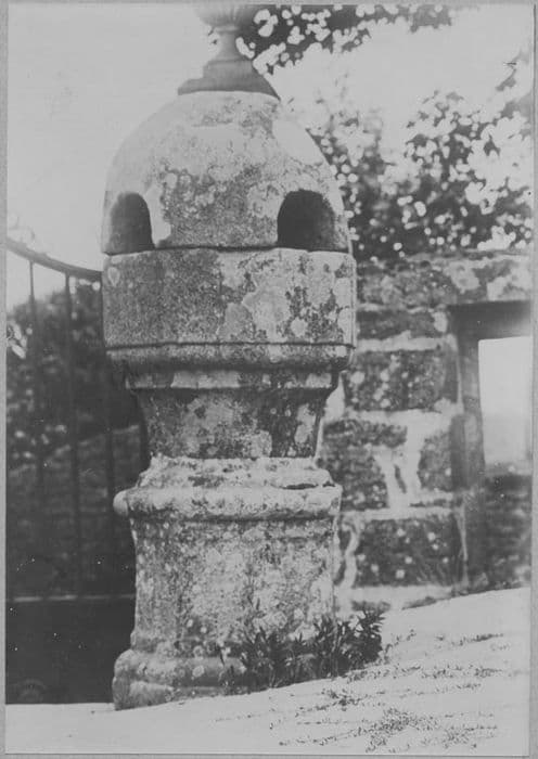Bénitier surmonté d'un couvercle en pierre, en forme de dôme percé de cinq niches et composé d'une cuve polygonale.