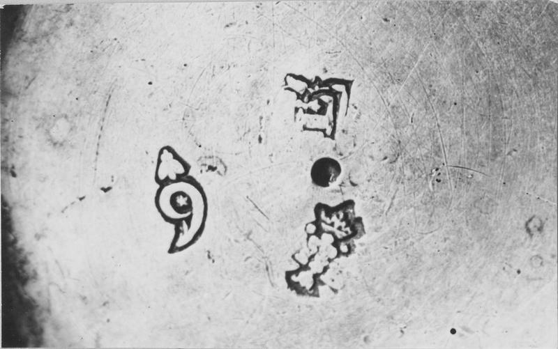 Poinçon de ville : L avec une hermine à droite, poinçon de communauté de Rennes, vers 1762, incomplet et déformé (sous le pied). Poinçon de charge : 9 inversé, avec une hermine au-dessus et une étoile à cinq branches dans la boucle du chiffre, poinçon de charge de la généralité de Rennes de 1756 à 1762 (sous le pied). Poinçon de maître : J B, avec une hermine au milieu, trois points au-dessus, sous une couronne, poinçon de maître présumé de Jean-Baptiste Buchet, son deuxième poinçon, reçu maître en 1724 (sous le pied).